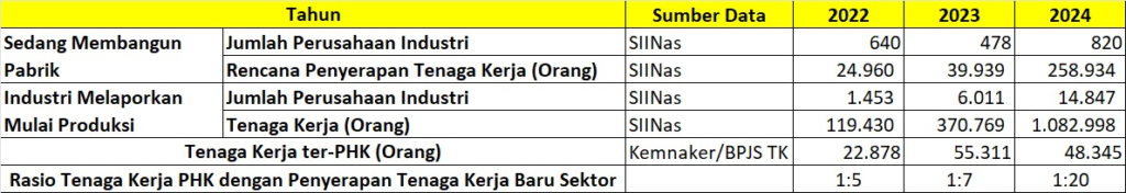 Berdasarkan data dari Sistem Informasi Industri Nasional (SIINas), pada tahun 2024, jumlah tenaga kerja baru yang diserap industri manufaktur yang mulai berproduksi tahun 2024 mencapai 1.082.998 tenaga kerja baru. Angka ini lebih besar dari jumlah PHK yang dilaporkan Kemenaker pada tahun 2024 sebesar 48.345 orang (sesuai data Kementerian Ketenagakerjaan). Sebagai catatan, jumlah pekerja yang ter-PHK pada periode tersebut bukan hanya merupakan pekerja di sektor manufaktur, tetapi angka total untuk semua sektor ekonomi.